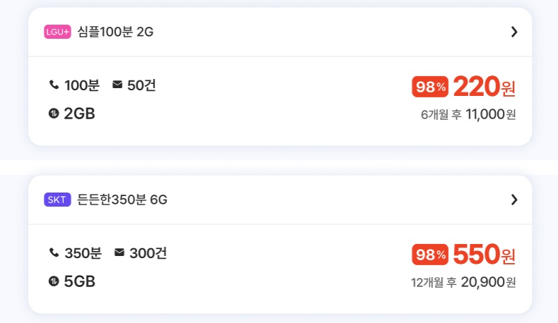 내용: 2GB 데이터, 100분 통화 및 50건 문자 제공.
