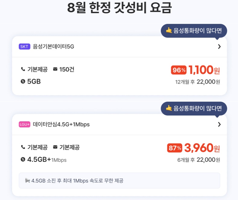 • 프로모션 대상: 이 프로모션은 후불 무약정 유심 상품에 한정됩니다. 프로모션 기간은 8월 1일부터 8월 31일까지입니다.