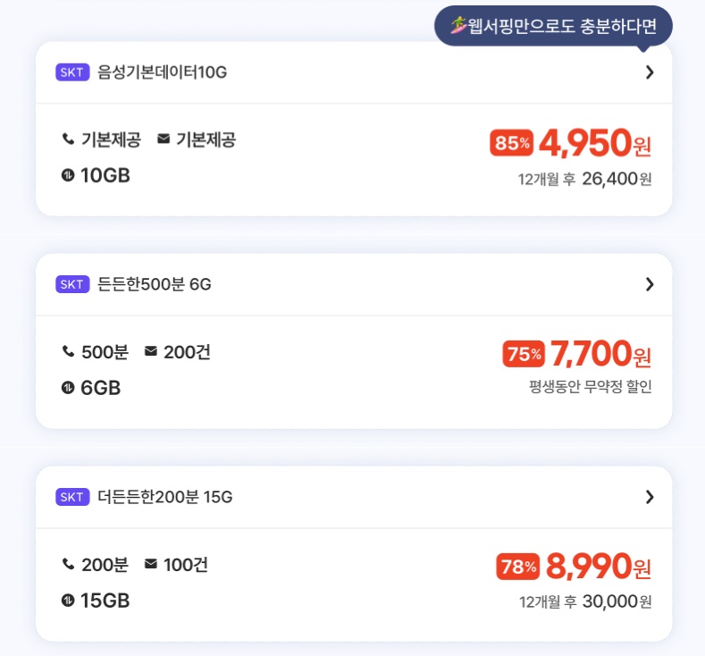 내용: 3GB 데이터, 기본 통화 및 문자 제공.